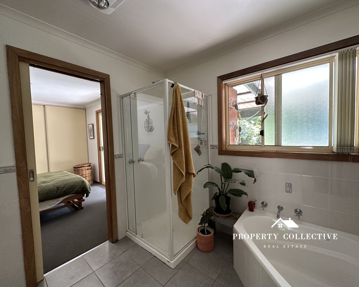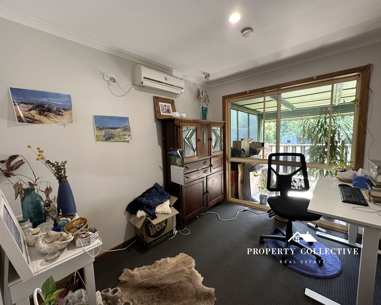 The home offers three bedrooms — the main with built-in robes and access to the main bathroom, a second bedroom located off the lounge, and a third featuring built-in robes and a study nook, perfect for working from home or creative pursuits. The bathroom includes a separate bath and shower for added functionality.