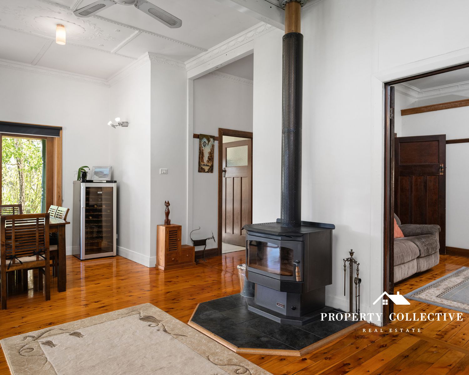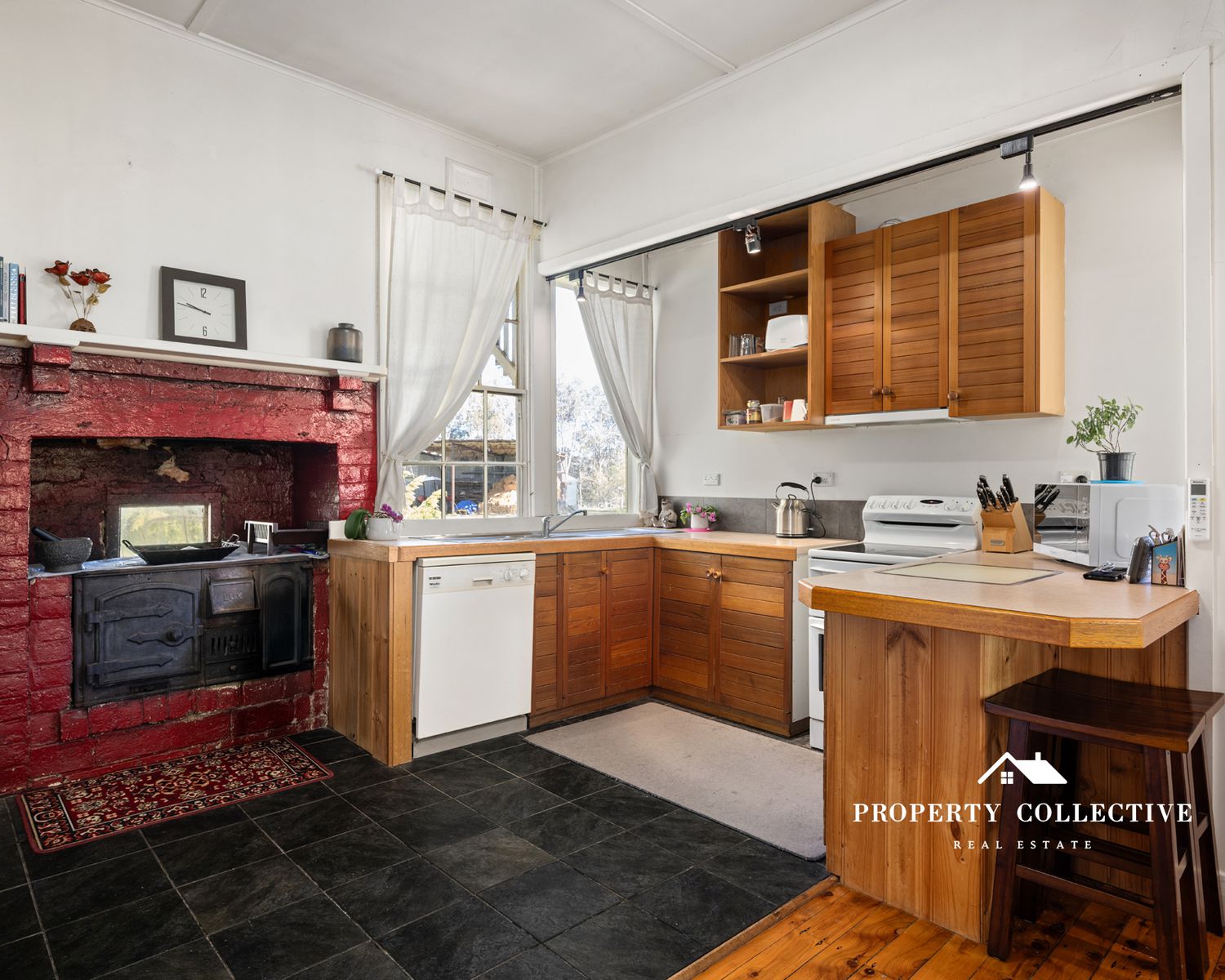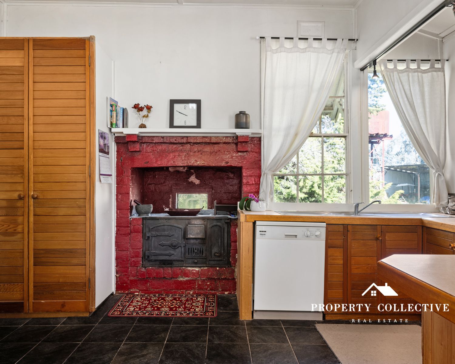 Inside, the home offers a warm and inviting layout with open-plan kitchen and dining, featuring a wood fire, timber cabinetry, freestanding electric stove/oven, dishwasher, and an old combustion stove adding authentic character. Two carpeted bedrooms with built-in robes provide comfort, while a third room could serve as a third bedroom or formal lounge with an open fireplace, making the home flexible to your lifestyle needs. The renovated bathroom, insulated walls, ceiling, and original stained timber floors add to the home’s enduring charm. A second toilet on the back verandah, complete with laundry and new electric hot water unit, adds convenience. Heating and cooling are taken care of with a split system and wood fire.