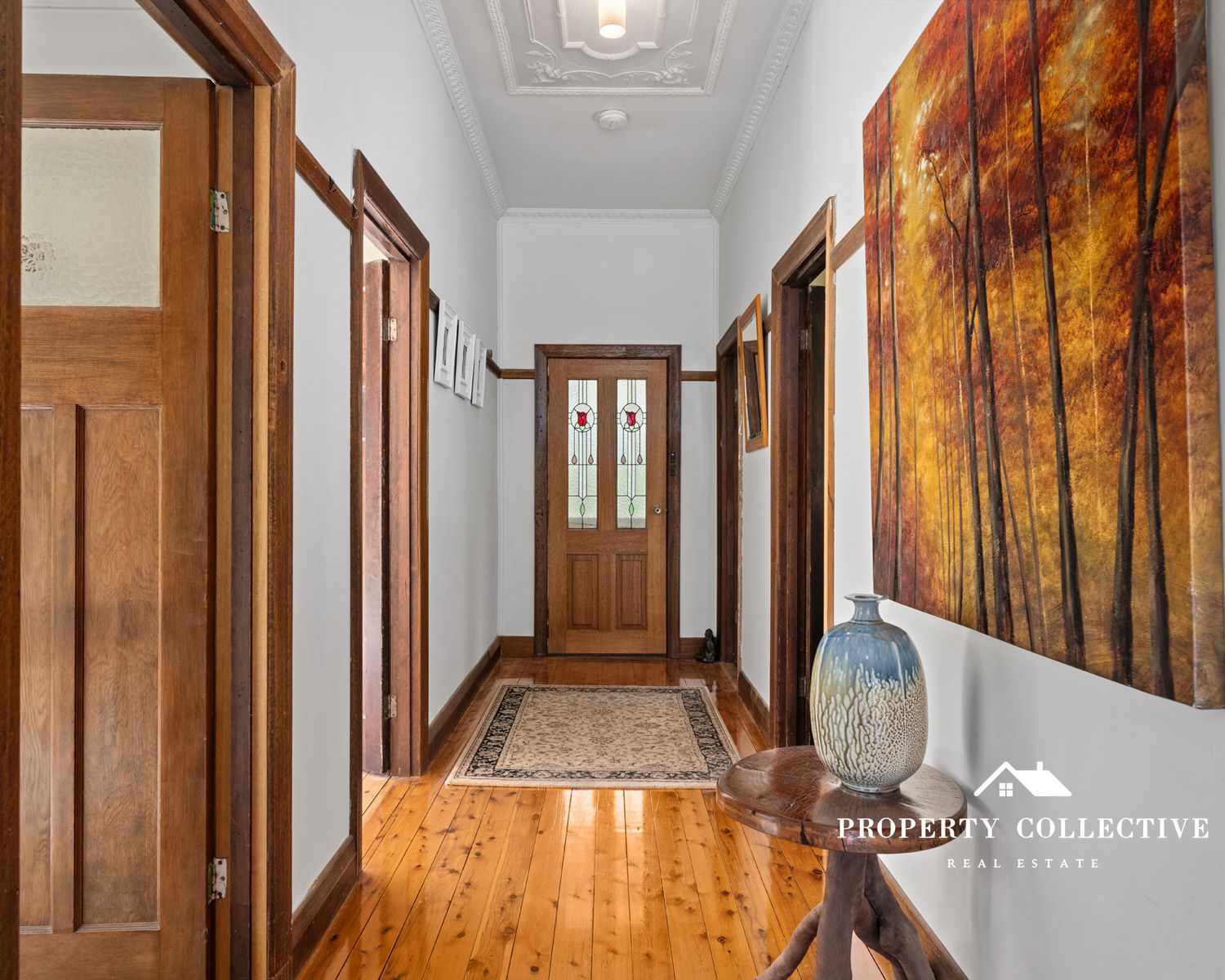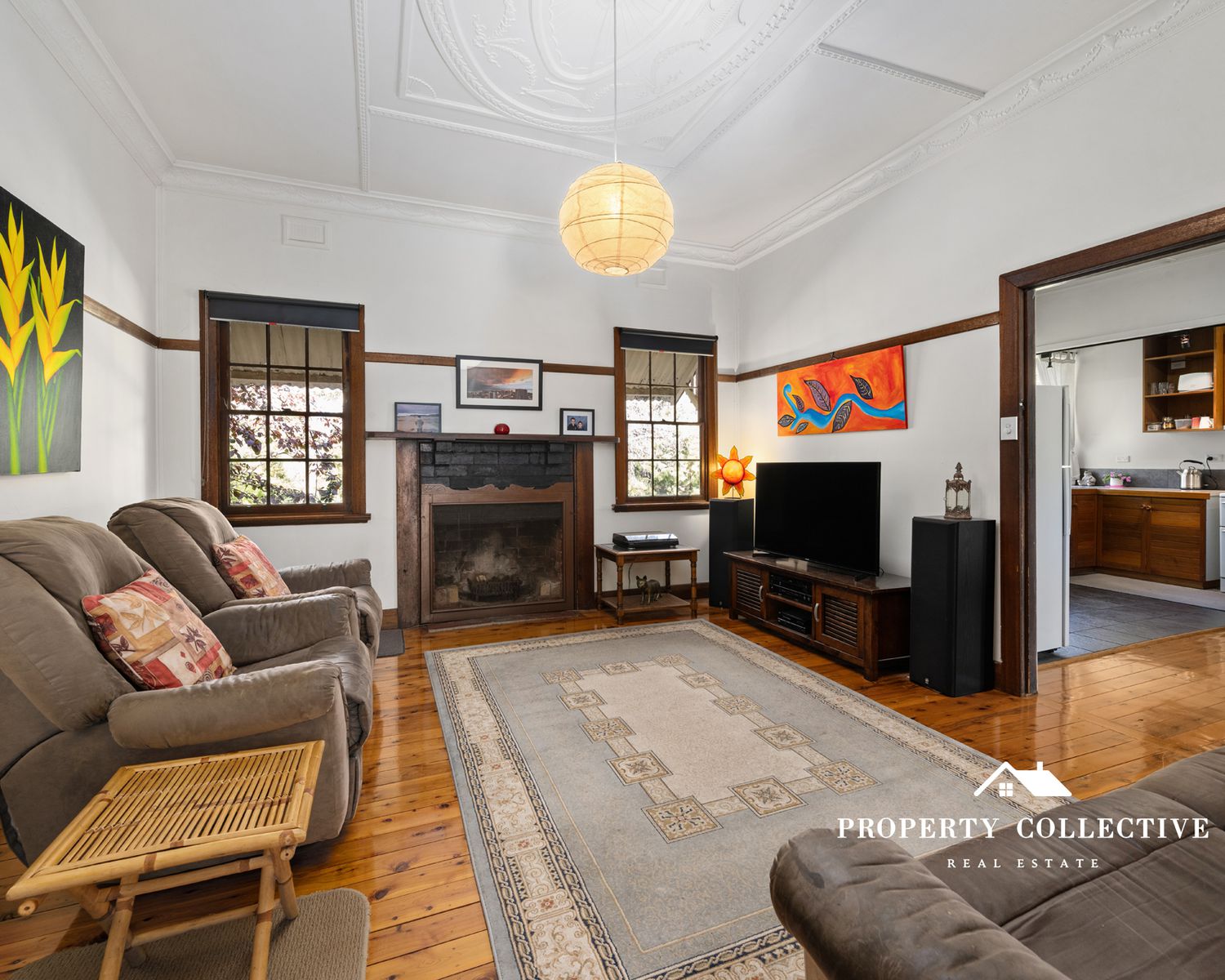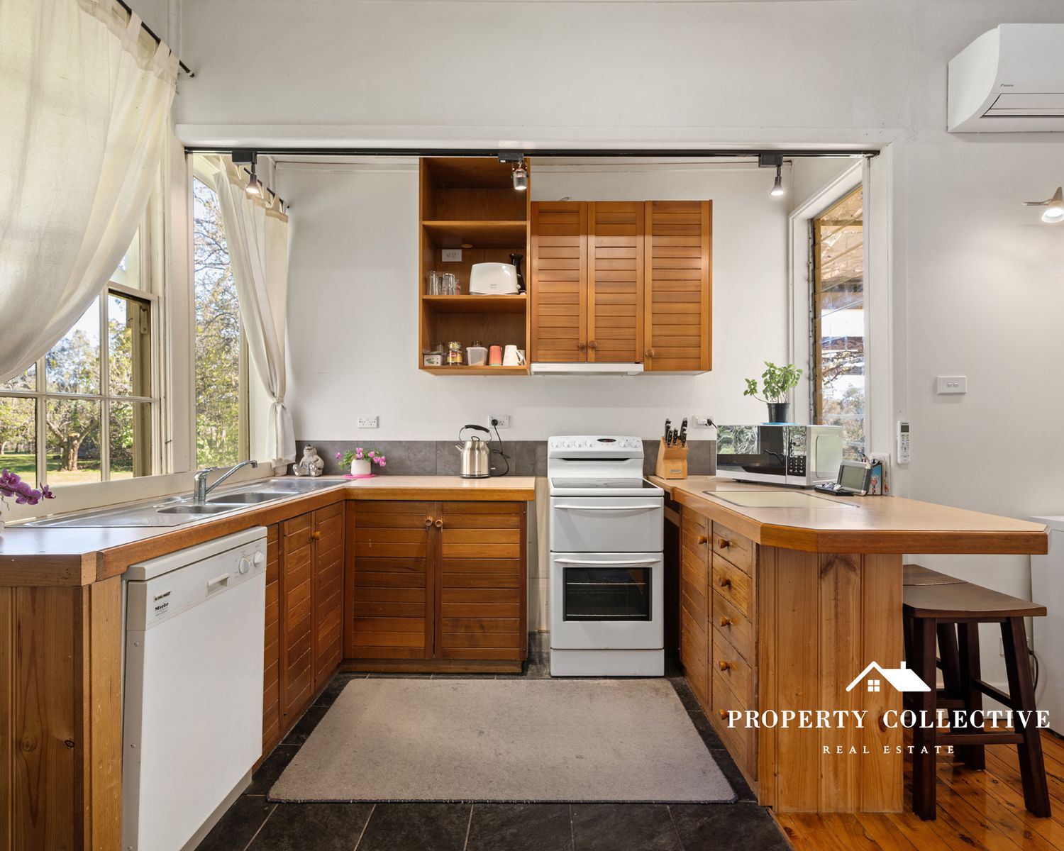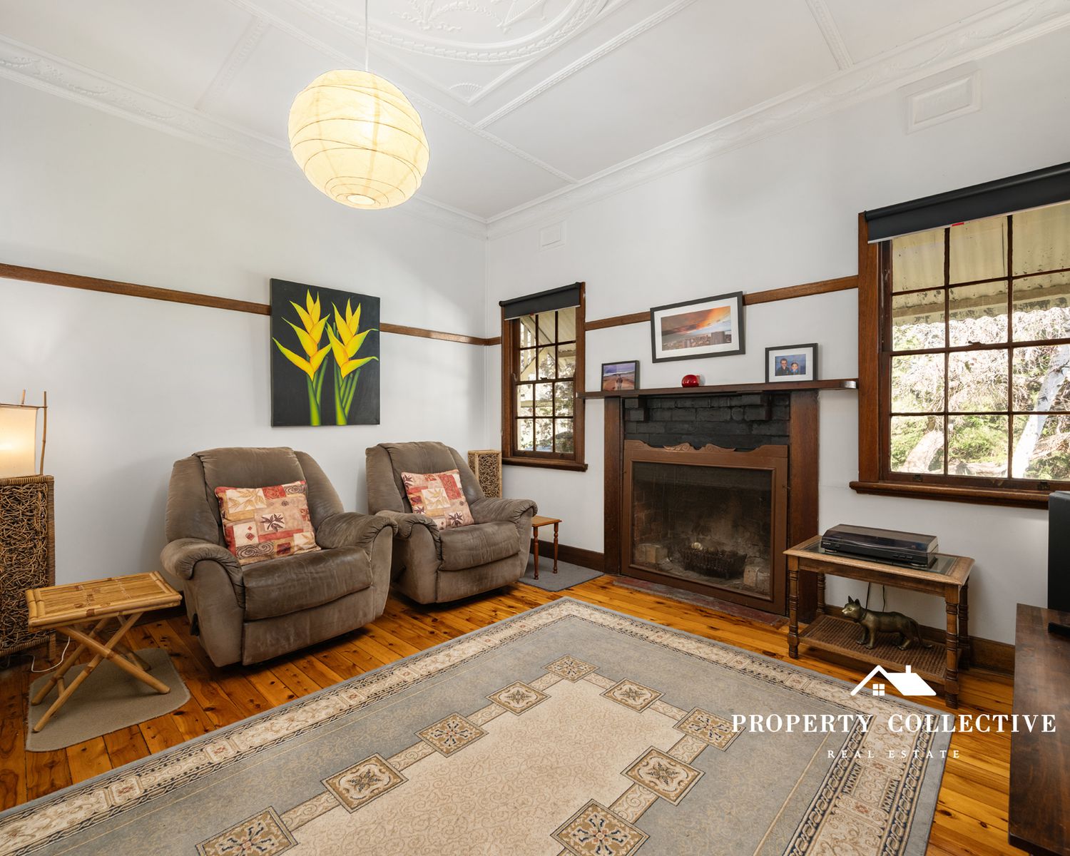 Inside, the home offers a warm and inviting layout with open-plan kitchen and dining, featuring a wood fire, timber cabinetry, freestanding electric stove/oven, dishwasher, and an old combustion stove adding authentic character. Two carpeted bedrooms with built-in robes provide comfort, while a third room could serve as a third bedroom or formal lounge with an open fireplace, making the home flexible to your lifestyle needs. The renovated bathroom, insulated walls, ceiling, and original stained timber floors add to the home’s enduring charm. A second toilet on the back verandah, complete with laundry and new electric hot water unit, adds convenience. Heating and cooling are taken care of with a split system and wood fire.