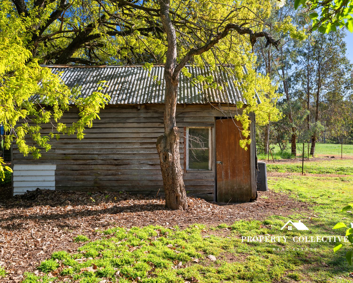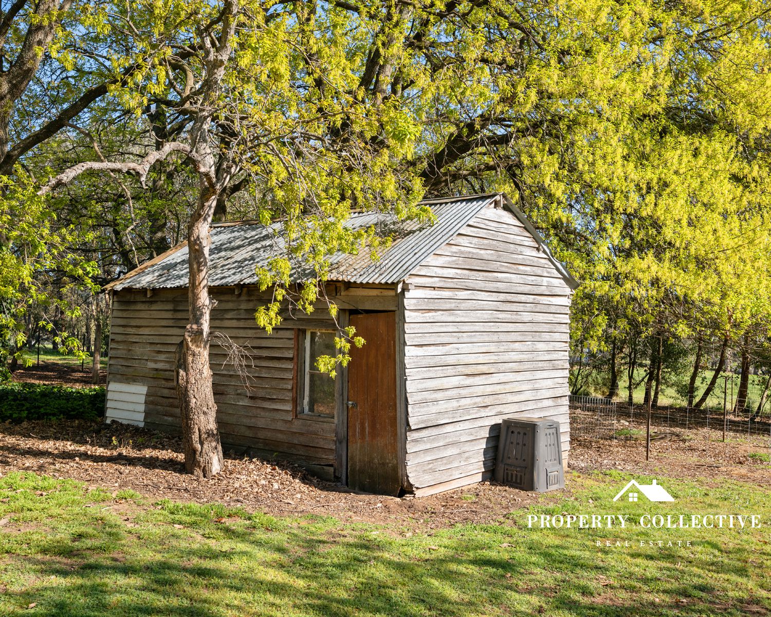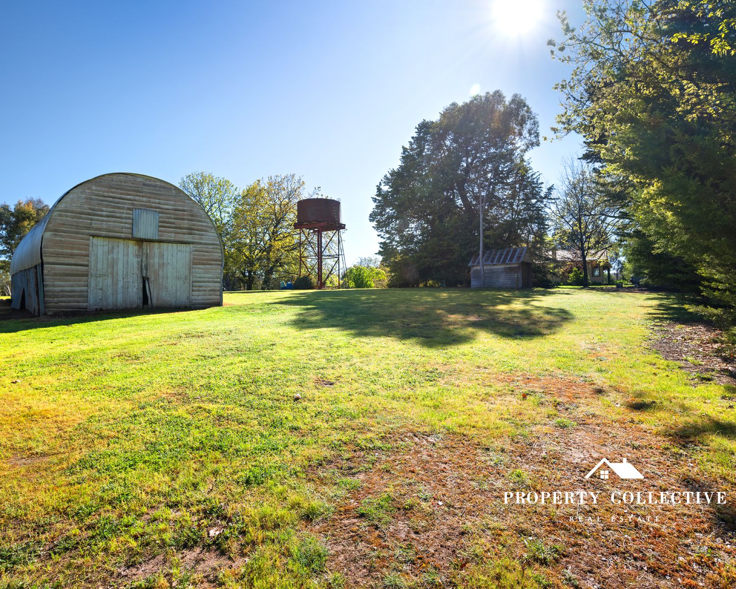 The property offers practical rural amenities, including two rainwater tanks feeding the house, supplemented by a newly installed water bore (delivering ample water), a small lock-up shed with a concrete floor, an old shearing shed, and a round-roof shed with electricity connected. Outside, a muscat grape vine grows along the back verandah, while established gardens, mature trees, and historical features—including the original front fence, old dairy, and a red tank stand from the old steam train station in Chiltern—enhance the charm and character of this unique property.
