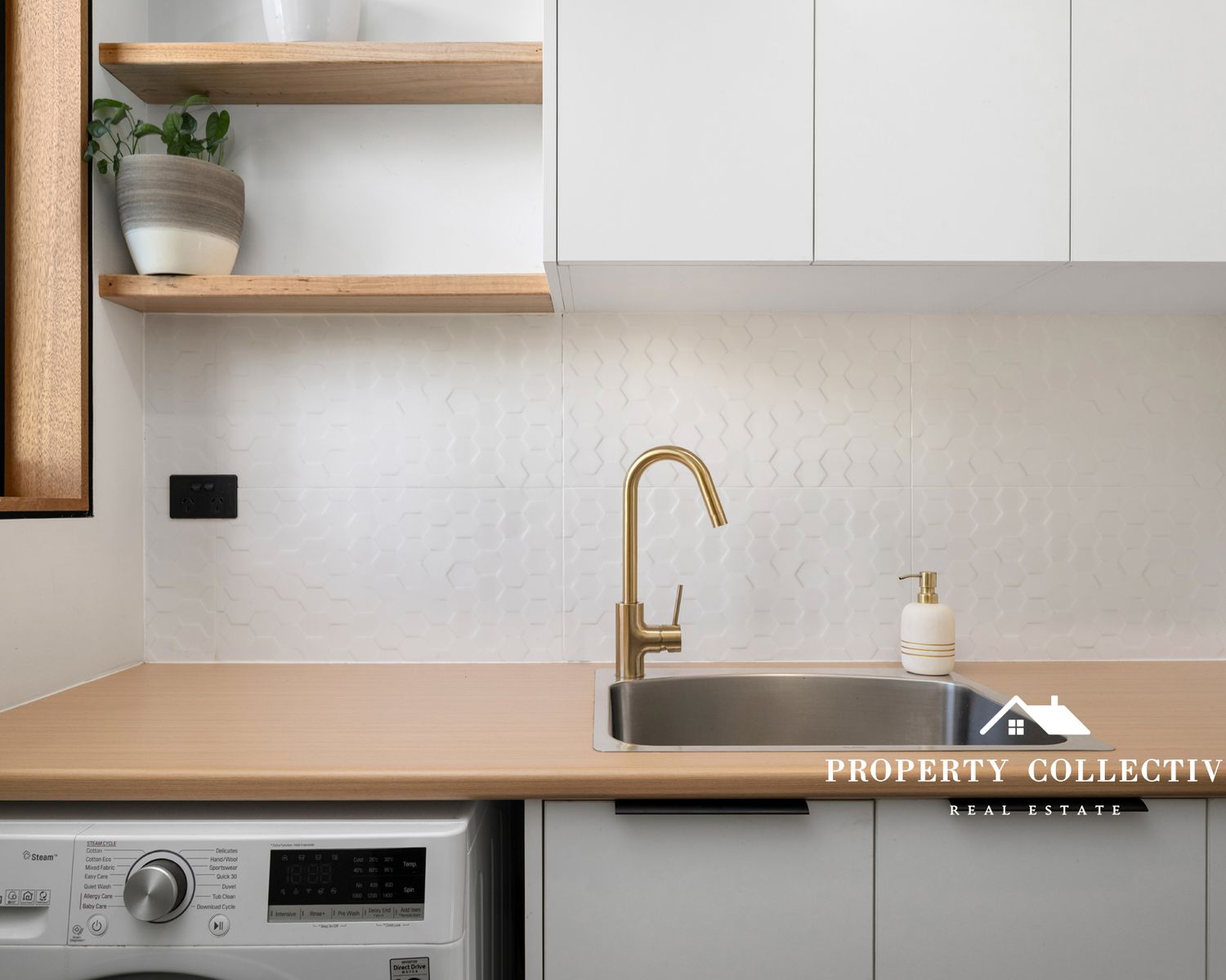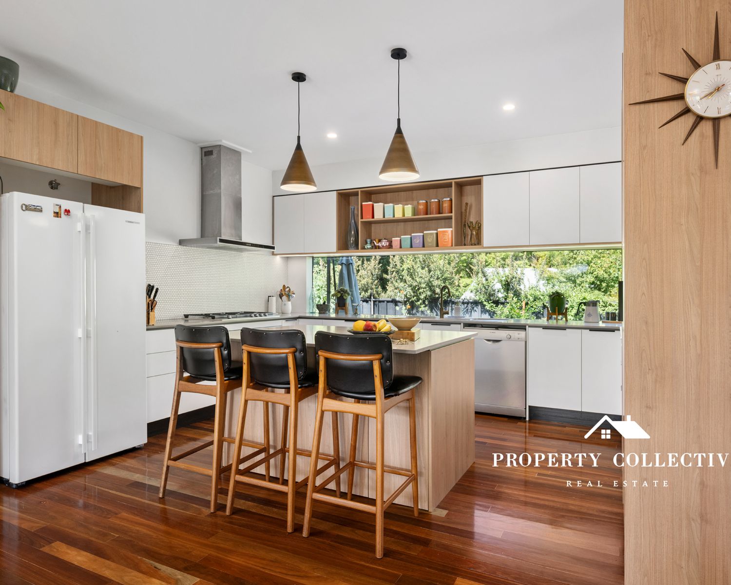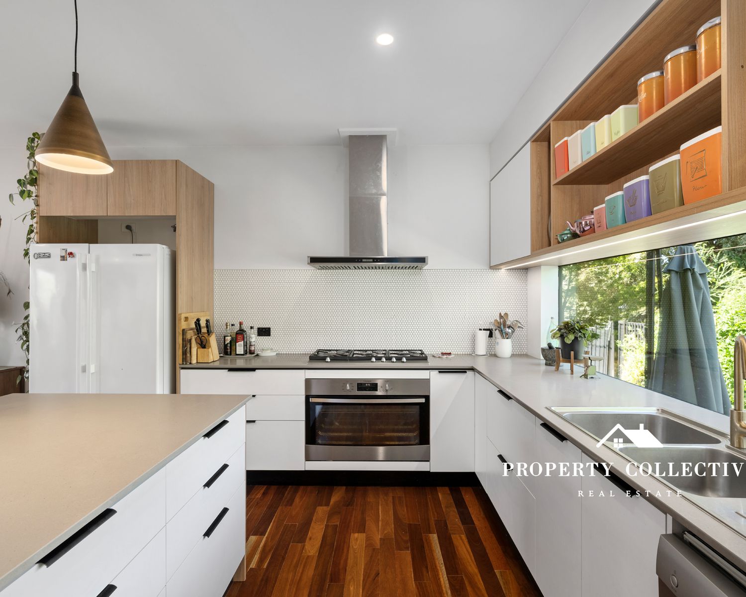 The upper level showcases locally sourced Spotted Gum timber flooring, flowing into a stunning kitchen where a dramatic four-metre window splashback overlooks the garden. Stone benchtops, soft-close cabinetry and premium Westinghouse 900mm appliances make this kitchen as functional as it is beautiful.