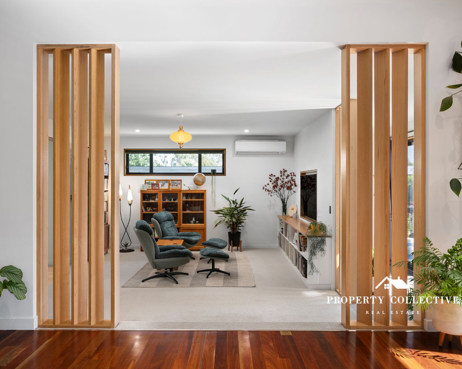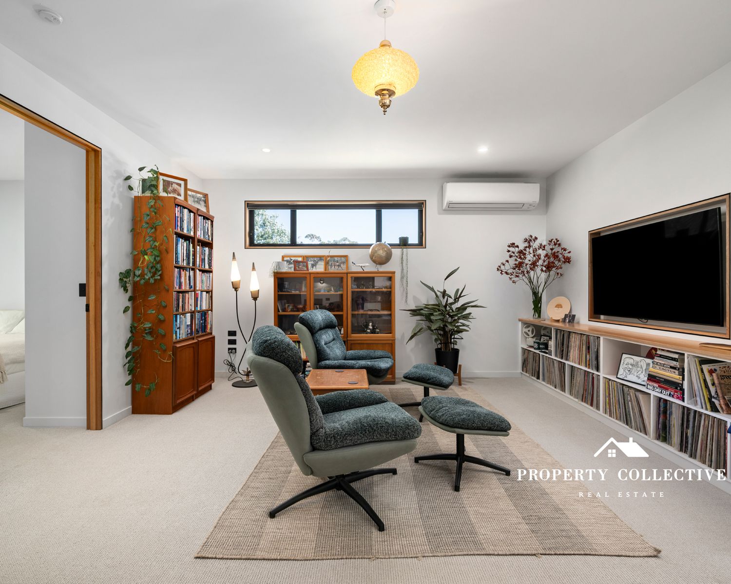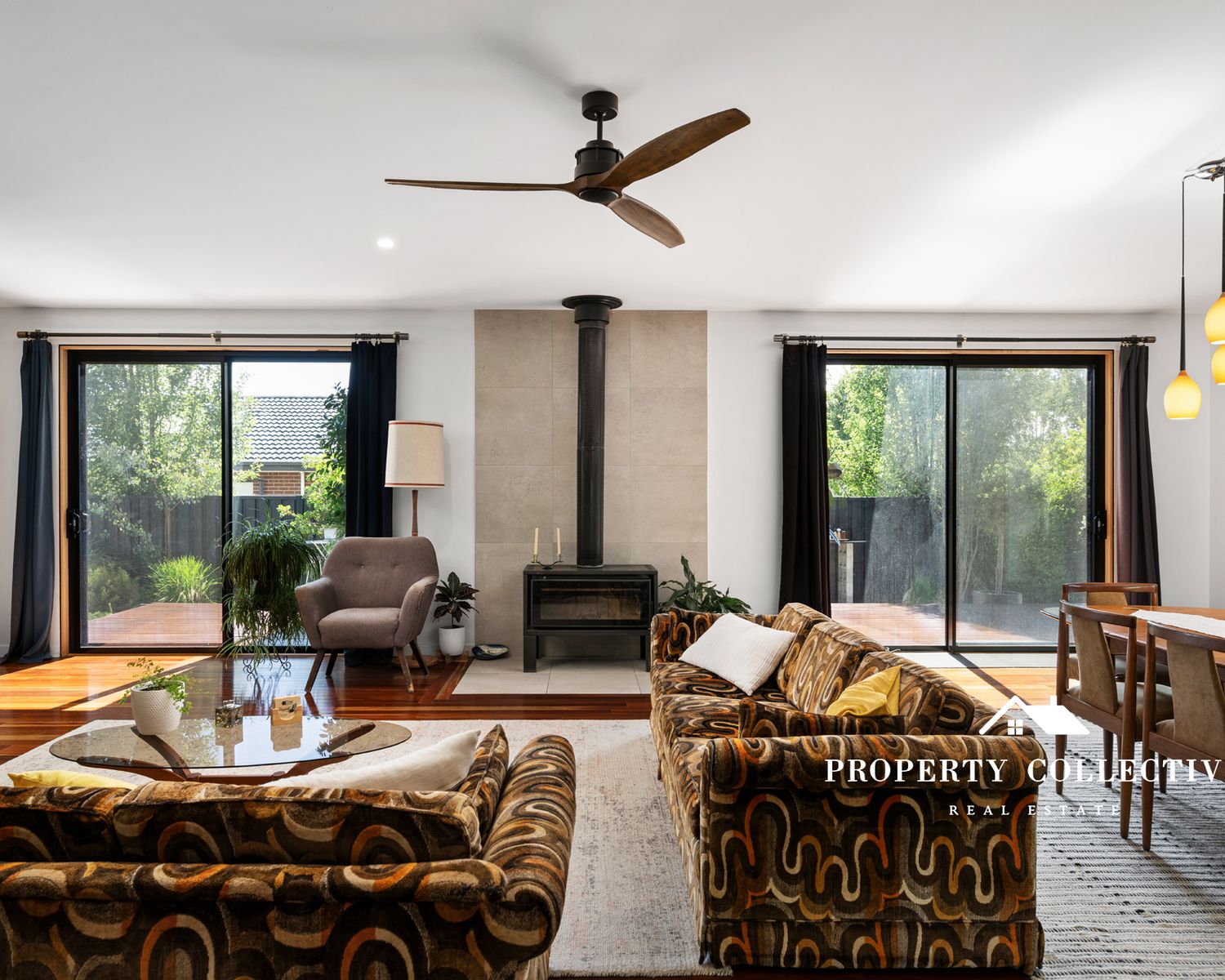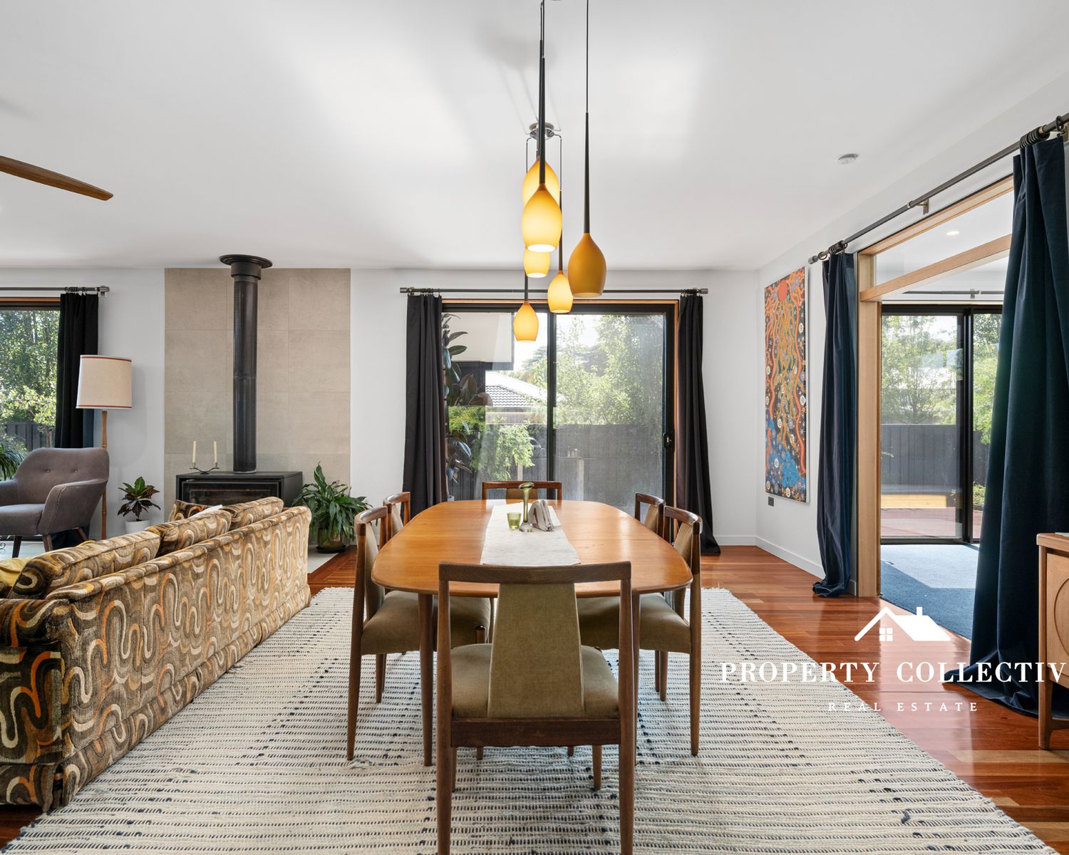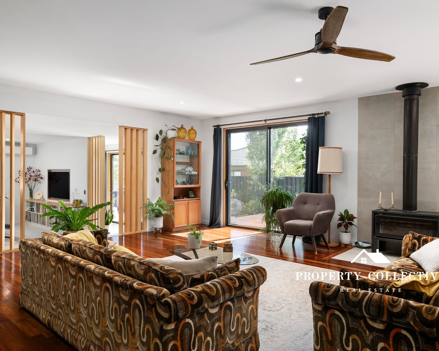 Living spaces are thoughtfully zoned, with a cosy sunken lounge on the lower level, carpeted for comfort and a wood combustion heater, alongside split-system heating and cooling for year-round climate control throughout.