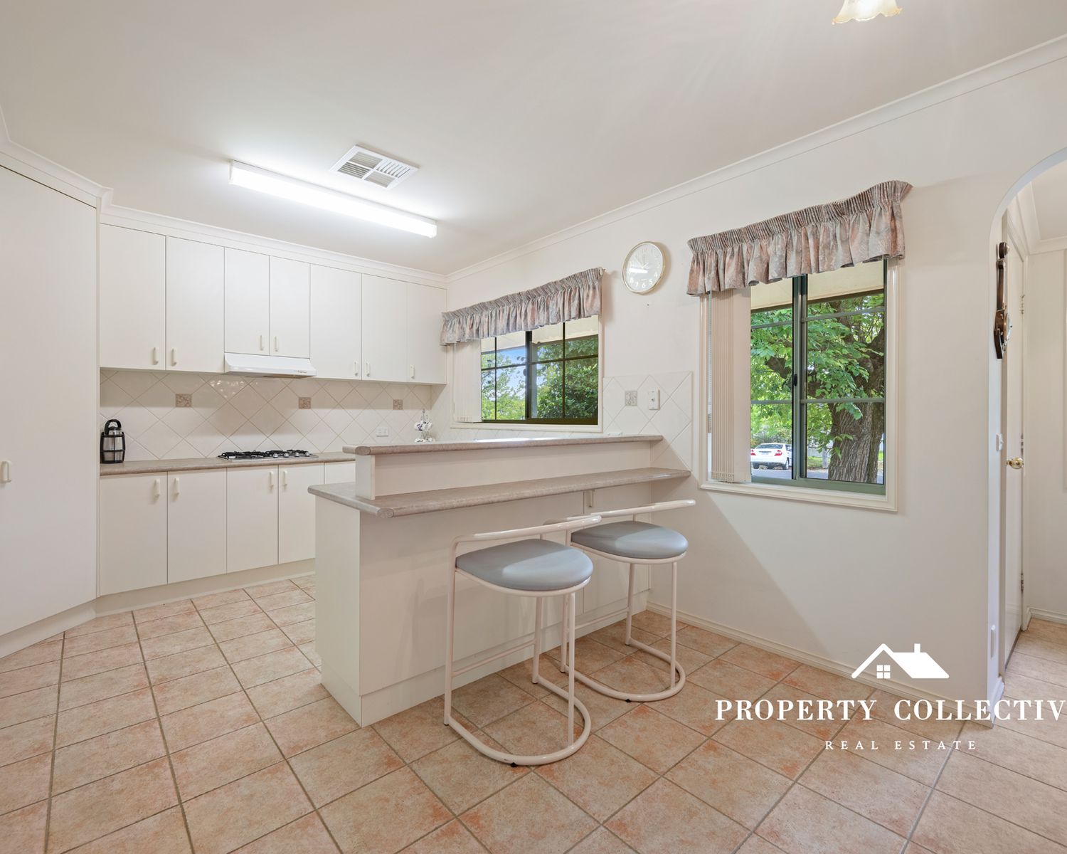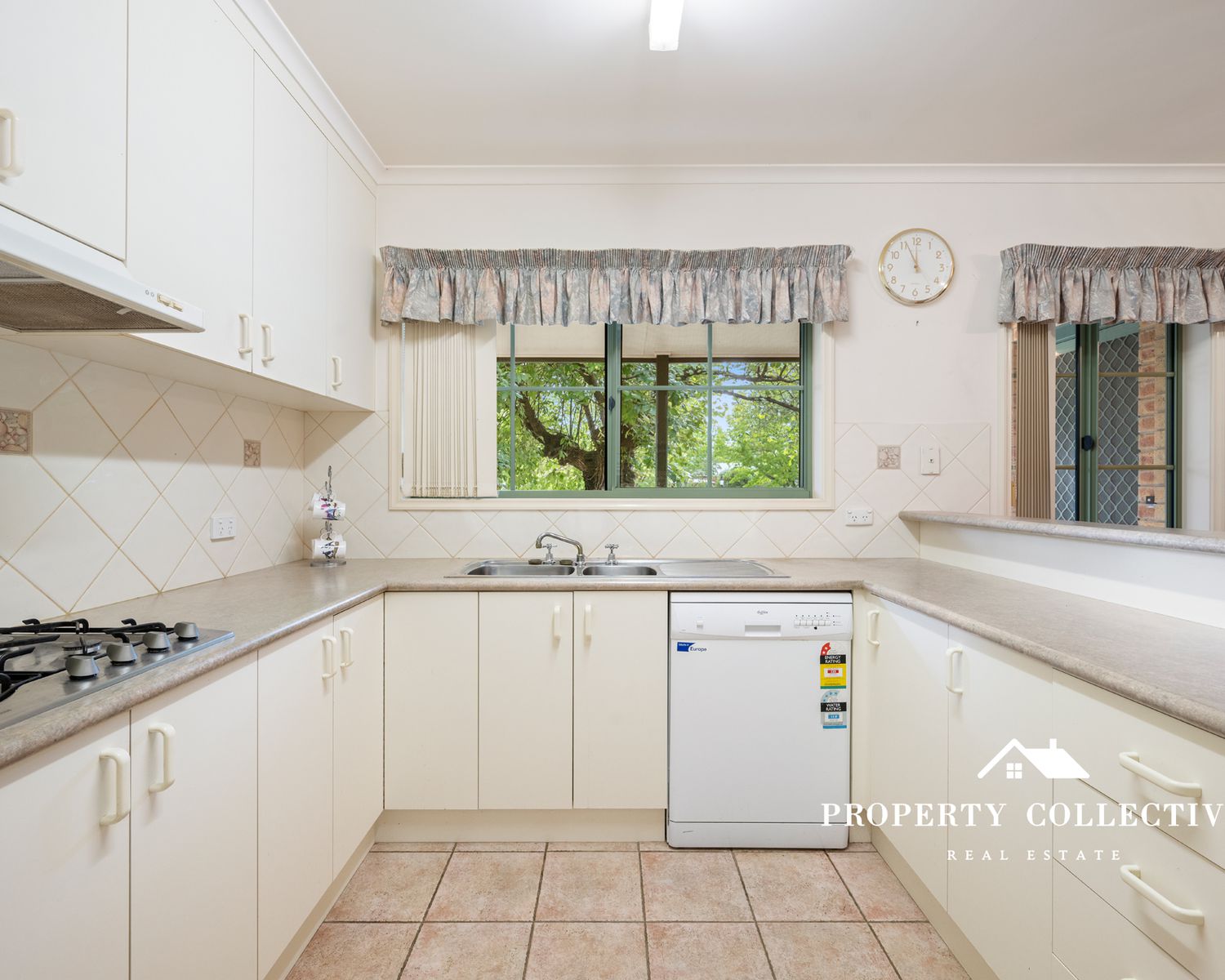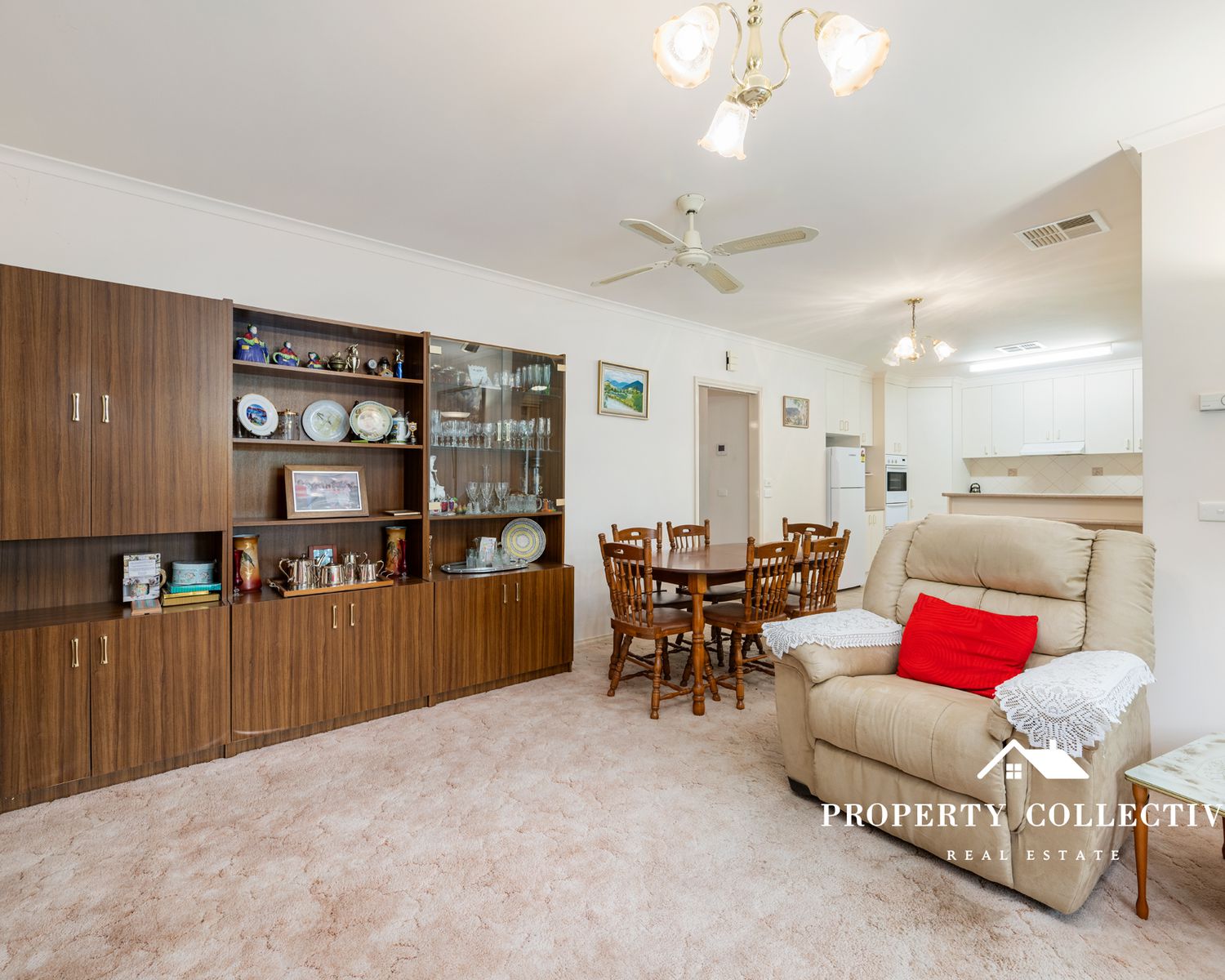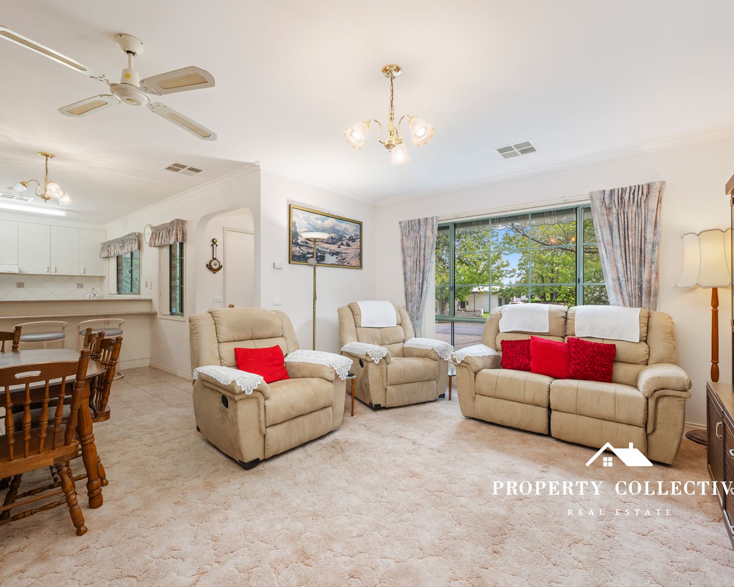 The well-appointed kitchen includes a gas cooktop, electric wall oven and dishwasher, with tiled flooring flowing through to the adjoining dining area. A carpeted lounge provides a cosy space to relax, while refrigerated heating and cooling throughout, additional floor heating, and ceiling fans in the living areas and bedrooms ensure year-round comfort.